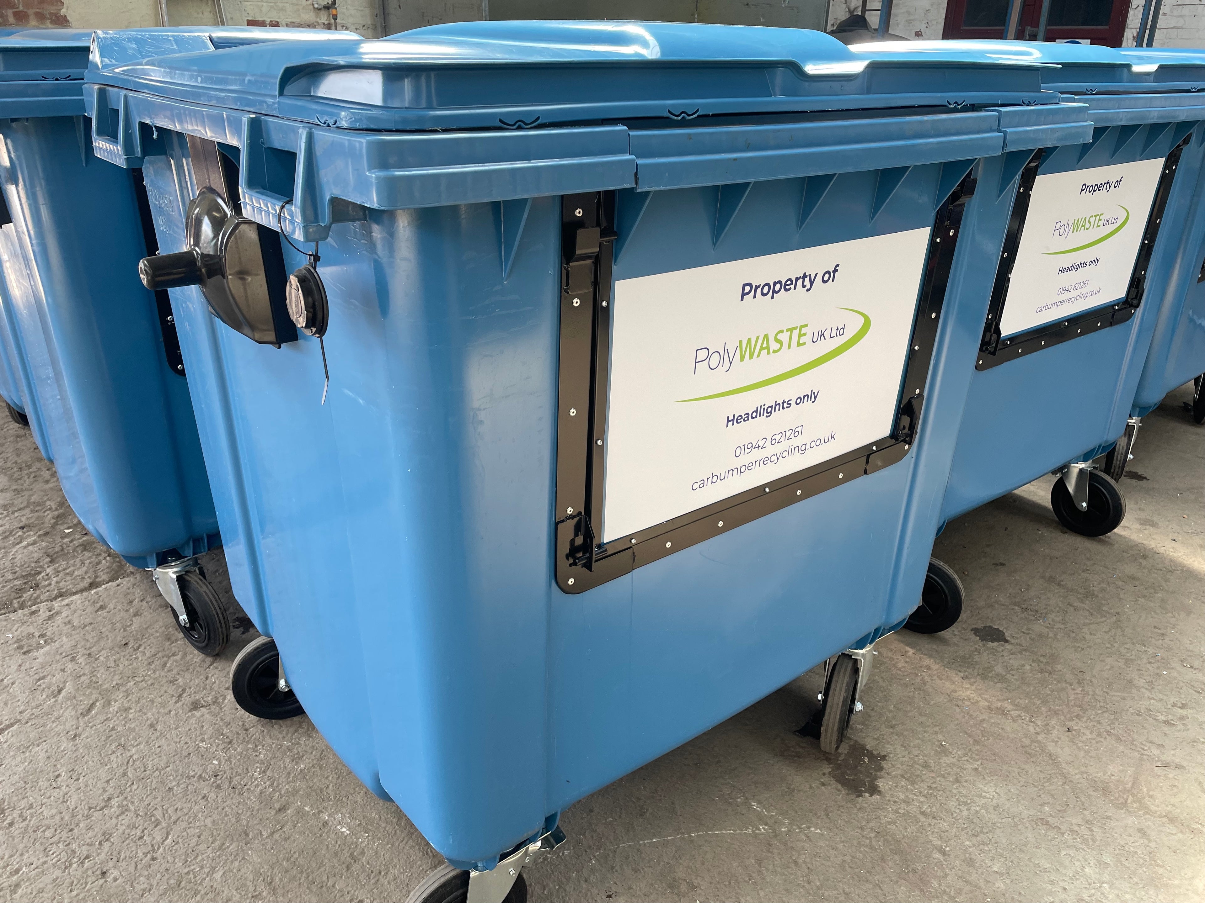 Wheelie bins provided to customers for storage of waste automotive headlights and tail lights.